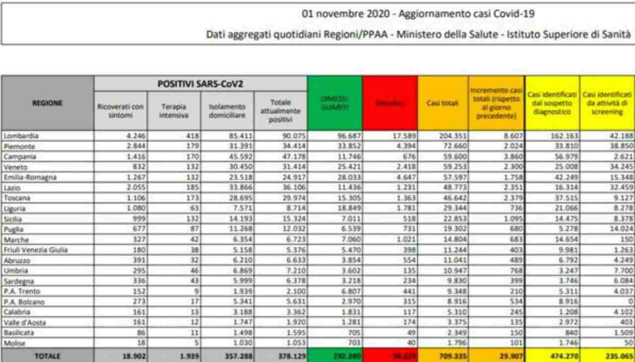 Numeri che migliorano ma in modo quasi impercettibile, tanto che non frenano il nuovo Dpcm del governo che sarà illustrato nel tardo pomeriggio o nella prima serata di domani, lunedì 2 novembre.