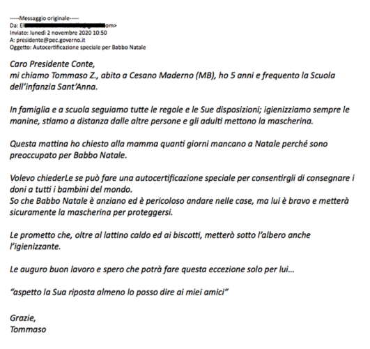 Un bambino di 5 anni scrive una letterina a Giuseppe Conte raccomandandosi per Babbo Natale che quest’anno avrà i suoi bei problemi a girare indisturbato per il mondo a consegnare i doni. Tommaso, di Cesano Maderno (Monza e Brianza), confessa al premier che a casa sua si rispettano tutte le regole di protezione dal coronavirus: “igienizziamo sempre le manine, stiamo a distanza dalle altre persone e gli adulti mettono la mascherina”