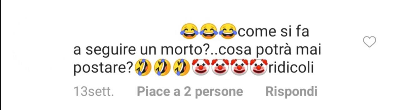Un black humour che non è tale, dal momento che questo hater continua a commentare le foto pubblicamente, denotando una mancanza di rispetto e di pudore indescrivibile: non c’è fine alla vergogna. Nemmeno di fronte alla morte l’odio riesce a placarsi.