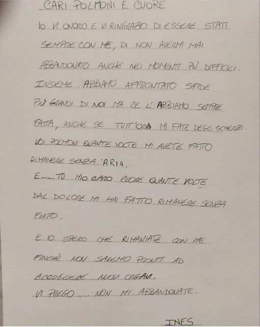 Ines scriveva al suo cuore a ai suoi polmoni: era diretta con loro, li ringraziava e li rimproverava perché a causa loro è stata operata 40 volte da quando è nata. Però era orgogliosa di averli, anche se per stare meglio aspettava un trapianto.