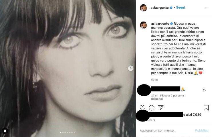 Asia Argento Instagram: l’attrice dice addio alla sua adorata mamma