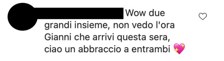 Tra i tantissimi commenti ricevuti, un affezionatissimo fan ha scritto: “Wow due grandi insieme, non vedo l’ora Gianni che arrivi questa sera, ciao un abbraccio a entrambi“.