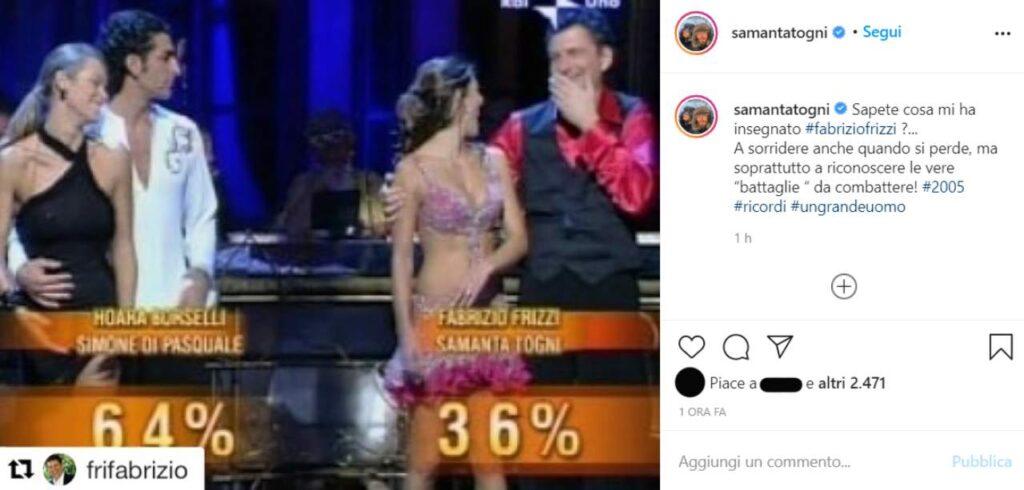 Ballare al fianco di Frizzi è stata un’esperienza indimenticabile per Samanta che mai ha scordato l’insegnamento che ne ha tratto. Come ha scritto su Instagram: “Sapete cosa mi ha insegnato Fabrizio Frizzi? A sorridere anche quando si perde, ma soprattutto a riconoscere le vere ‘battaglie’ da combattere”.