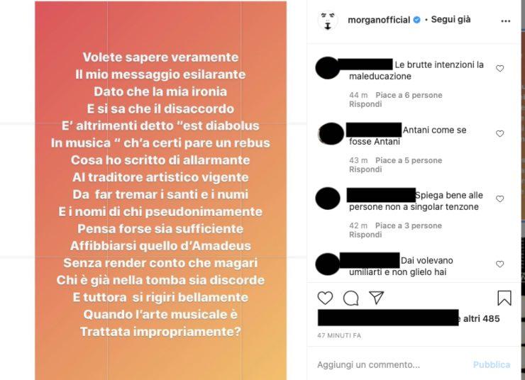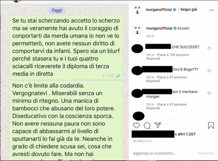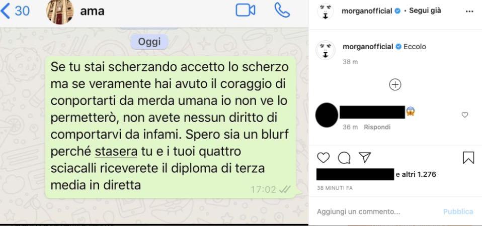 Ora, su Instagram, quest’ultimo pubblica un presunto scambio di messaggi che avrebbe avuto con Amadeus, o per meglio dire il messaggio che Morgan avrebbe inviato al direttore artistico di Sanremo.