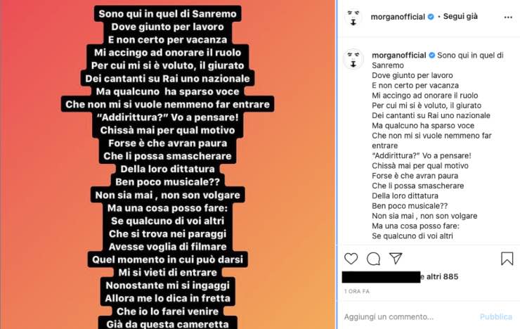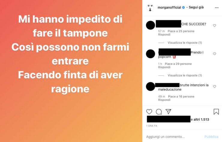 Inoltre, Morgan ha scritto dei messaggi anche affidate alle stories Instagram in cui spiega di essere arrivato a Sanremo per compiere il suo ruolo di giurato dei cantanti su Rai 1, ma poi precisa: “Mi hanno impedito di fare il tampone, così possono non farmi entrare facendo finta di aver ragione.”