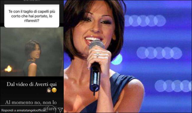 Tra le varie domande un fan ha chiesto: “Il taglio più corto che hai provato, lo rifaresti?” Anna Tatangelo ha postato uno scatto da video di Averti Qui. La cantante sfoggiava nel video un taglio a caschetto nero corvino, uno dei tanti look che ha portato negli anni. Tuttavia, nonostante nell’ultimo periodo abbia cambiato radicalmente il suo nuovo coloro, biondo platino, ha ammesso che un taglio corto così non lo posterebbe mai più.