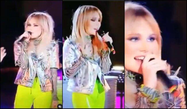 I lunghi capelli biondi lasciati dritti sulle spalle, giacca metallizzata con borchie e pantalone verde acido, decisame too much.
