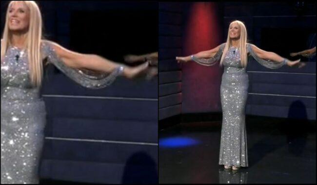 Eclettica e sempre con il sorriso sulle labbra, Maria Teresa Ruta non ha certo bisogno di lustrini e paillettes per brillare. Avremmo fatto volentieri a meno del suo tubino argento costellato di paillettes, too much perfino per la prima serata, ma a Maria Teresa le si perdona tutto, anche lustrini.