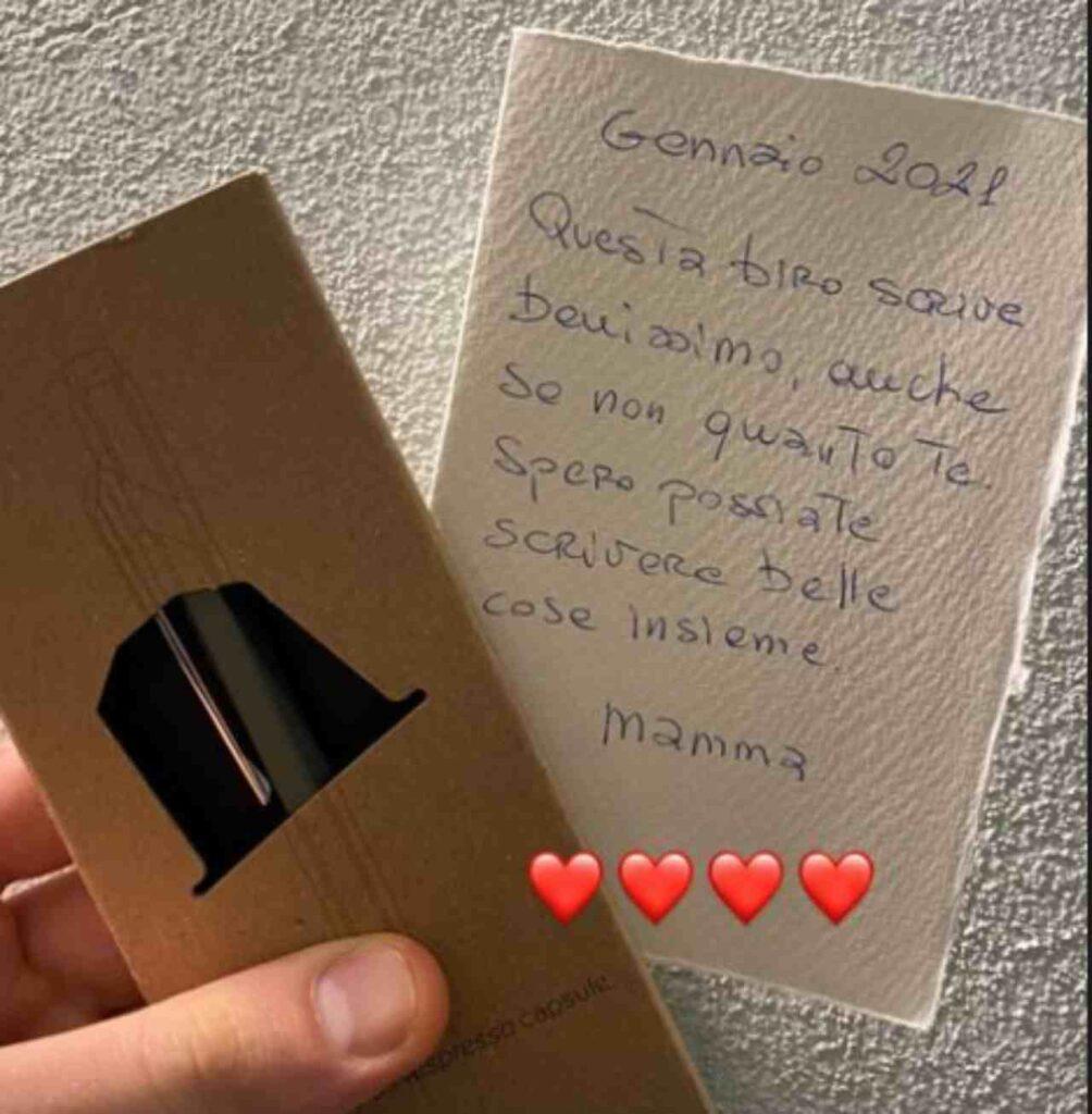 “Questa biro scrive benissimo, anche se non quanto te. Spero possiate scrivere belle cose insieme. Mamma”, con questa semplice ma splendida dedica, Anna Dan ha fatto felice il figlio che ha prontamente postato su Instagram il regalo, mostrandolo fiero ai suoi follower.