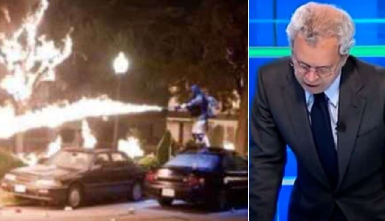 Che gaffe Mentana! Il lanciafiamme contro la folla: tra la confusione del momento spunta la scena di un film