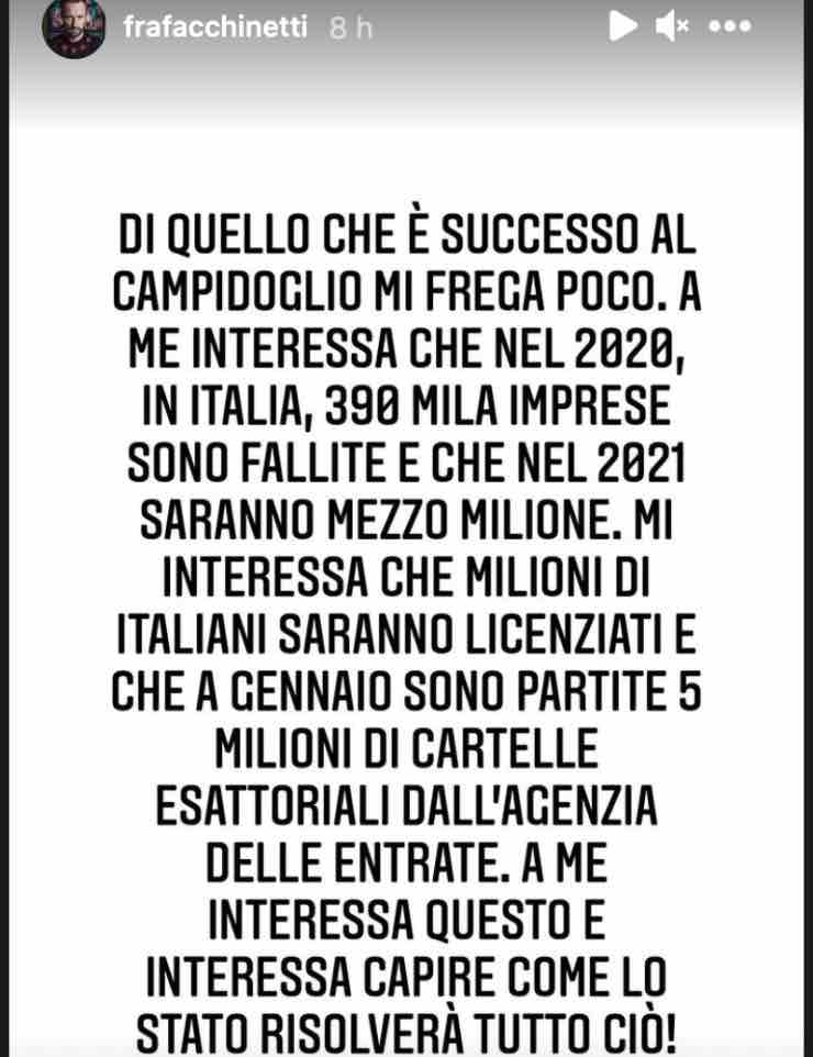 In merito, con una lunga storia sulla sua pagina Instagram, ha spiegato: “Di quello che è successo al Campidoglio mi frega poco. A me interessa che nel 2020, in Italia, 390 mila imprese sono fallite e che nel 2021 saranno mezzo milione“.