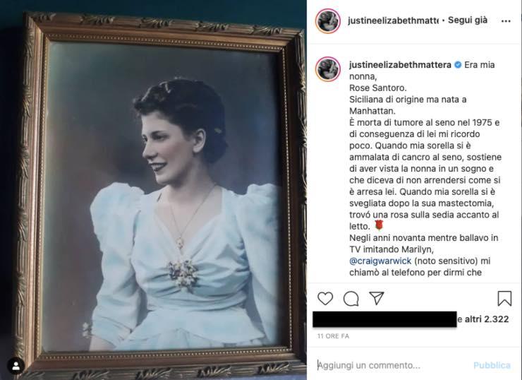 “Era mia nonna, Rose Santoro. Siciliana di origine ma nata a Manhattan.“, inizia così il post in cui Justine mostra accanto al testo, in foto, proprio sua nonna che appare in un ritratto.