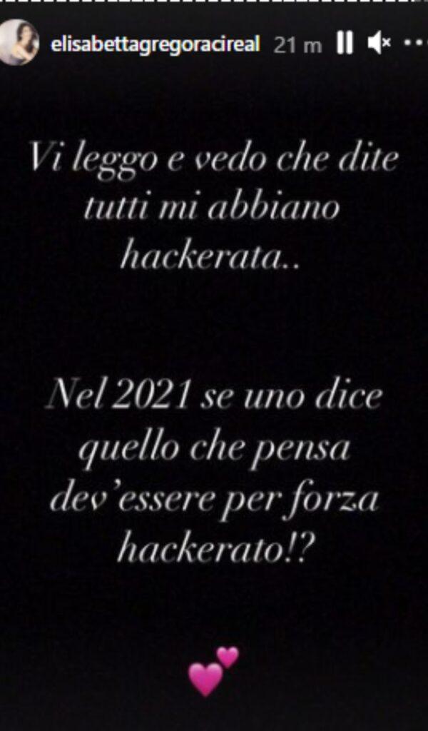 Tuttavia un’ennesima storia sul profilo ufficiale smentirebbe questa tesi: “Nel 2021 se uno dice quello che pensa dev’essere per forza hackerato?” Ma se si tratta davvero di Elisabetta Gregoraci, perché scegli di scrivere e non mostrare il volto? Il dubbio resta. Pare poi che tramite i messaggi di Instagram la Gregoraci abbia chiesto ad alcune note pagine di diffondere la notizia che le storie pubblicate sul suo profilo non siano altro che il risultato di un attacco hacker ai suoi danni.