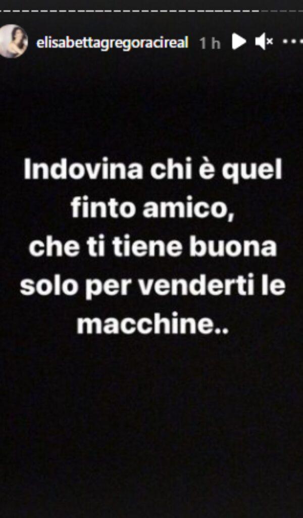 Poi le storie della Gregoraci hanno totalmente cambiato registro e sono apparse numerose accuse nei confronti di ex compagni di avventura, annunciate da una storia particolare “Ciao ragazzi, adesso tolto i paletti: ora parlo io.” Il primo a finire nel mirino è Francesco Oppini, noto venditore di auto: “Indovinate chi è quel finto amico che ti tiene buona solo per venderti le auto.