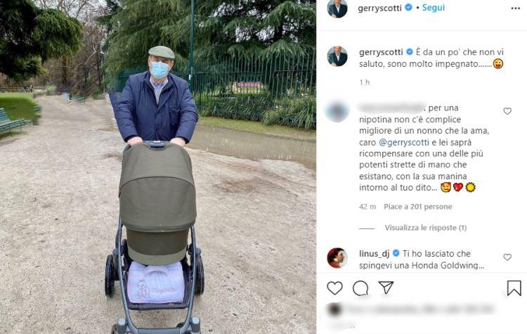 Basco e passeggino, la trasformazione in nonno per Gerry Scotti è completata, munito di mascherina si gode una passeggiata al parco con la sua nipotina Ginevra, la piccola nata lo scorso dicembre ha portato una ventata di gioa e amore nella vita del conduttore.