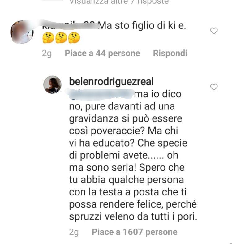 Una donna ha poi rincarato la dose “Ma sto figlio di chi è?”, stanca dei commenti Belen ha voluto rispondere ancora una volta “Ma io dico no, anche davanti a una gravidanza si può essere così poveracce? Ma chi vi ha educato“ ha scritto la showgirl “Che problemi avete, oh ma sono seria. Spero che tu abbia qualche persona con la testa a posta che ti possa rendere felice perché spruzzi veleno da tutti i pori.”