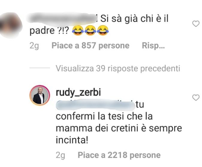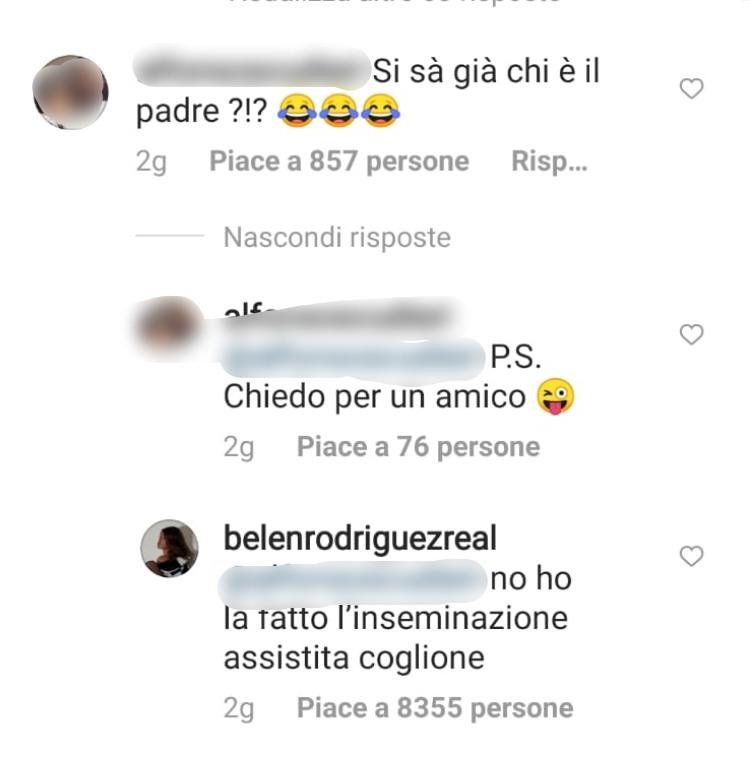 “Si sa già chi è il padre” ha chiesto con irriverenza un utente sotto al profilo di Belen, proprio sotto al post nel quale la showgirl mostra fiera la sua pancia. La showgirl ha risposto piccata “No, ho fatto l’inseminazione assistita cogl*one.” All’uomo ha risposto anche Rudy Zerbi, intervenuto in difesa della collega e amica “Tu confermi la tesi che la mamma dei cretini è sempre incinta.”