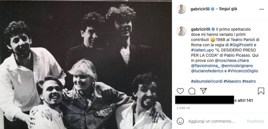 A spiegarlo è lo stesso Gabriele nelle didascalia che accompagna il post e che spiega il momento ritratto, ovvero quello di una prova: “Il primo spettacolo dove mi hanno versato i primi contributi (faccina che ride). 1988 al Teatro Parioli di Roma con la regia di Gigi Proietti e Valter Lupo “IL DESIDERIO PRESO PER LA CODA” di Pablo Picasso.