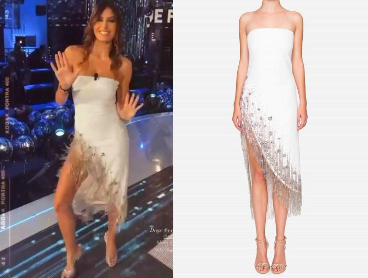 Protagonista pur avendo lasciato la casa lo scorso dicembre, Elisabetta Gregoraci ha lasciato tutti a bocca aperta con il suo tubino bianco impreziosito da lunghe frange luminose. L’abito non è in commercio, come già successo nelle scorse settimane, la showgirl ha affittato il look per la serata.