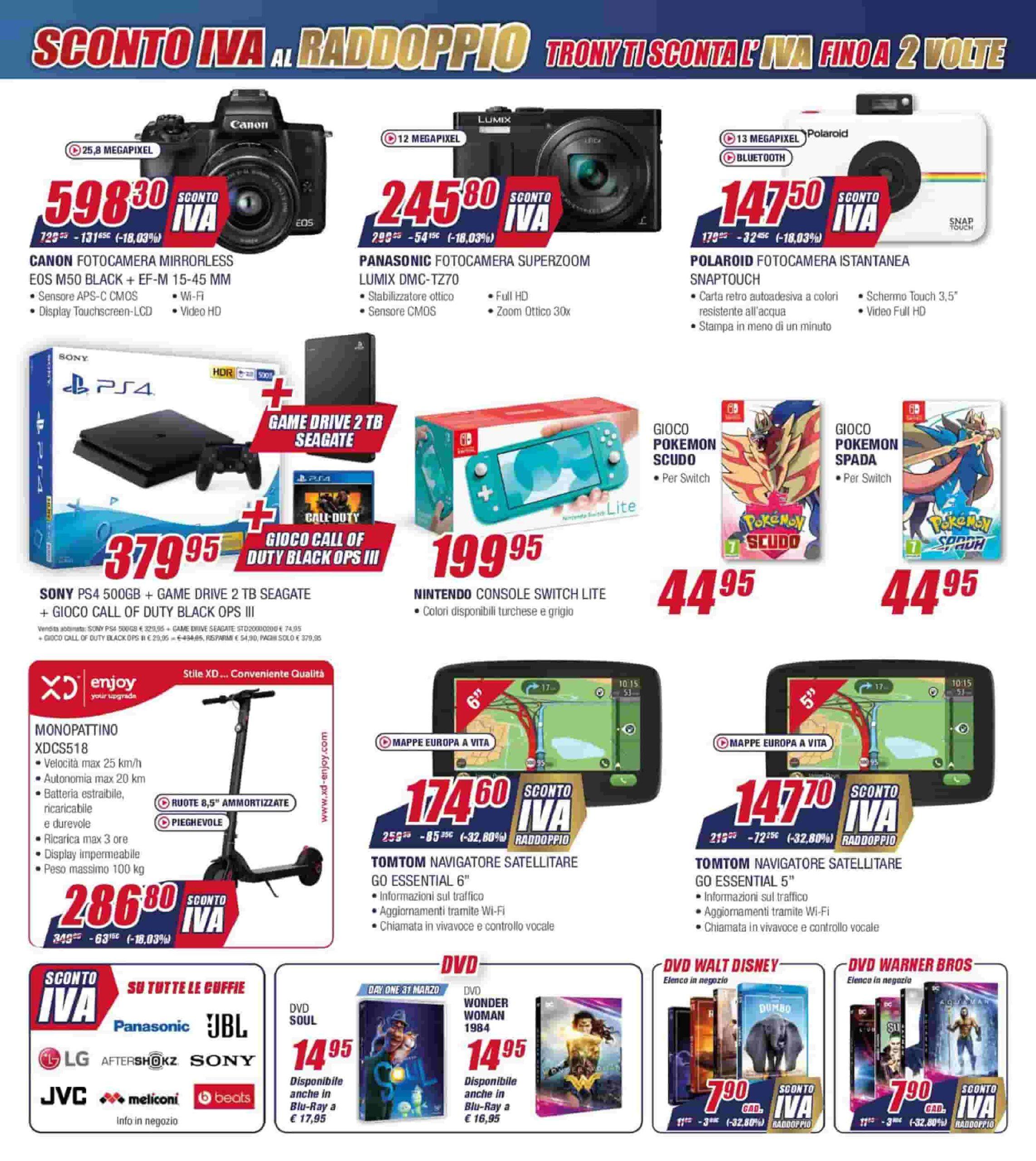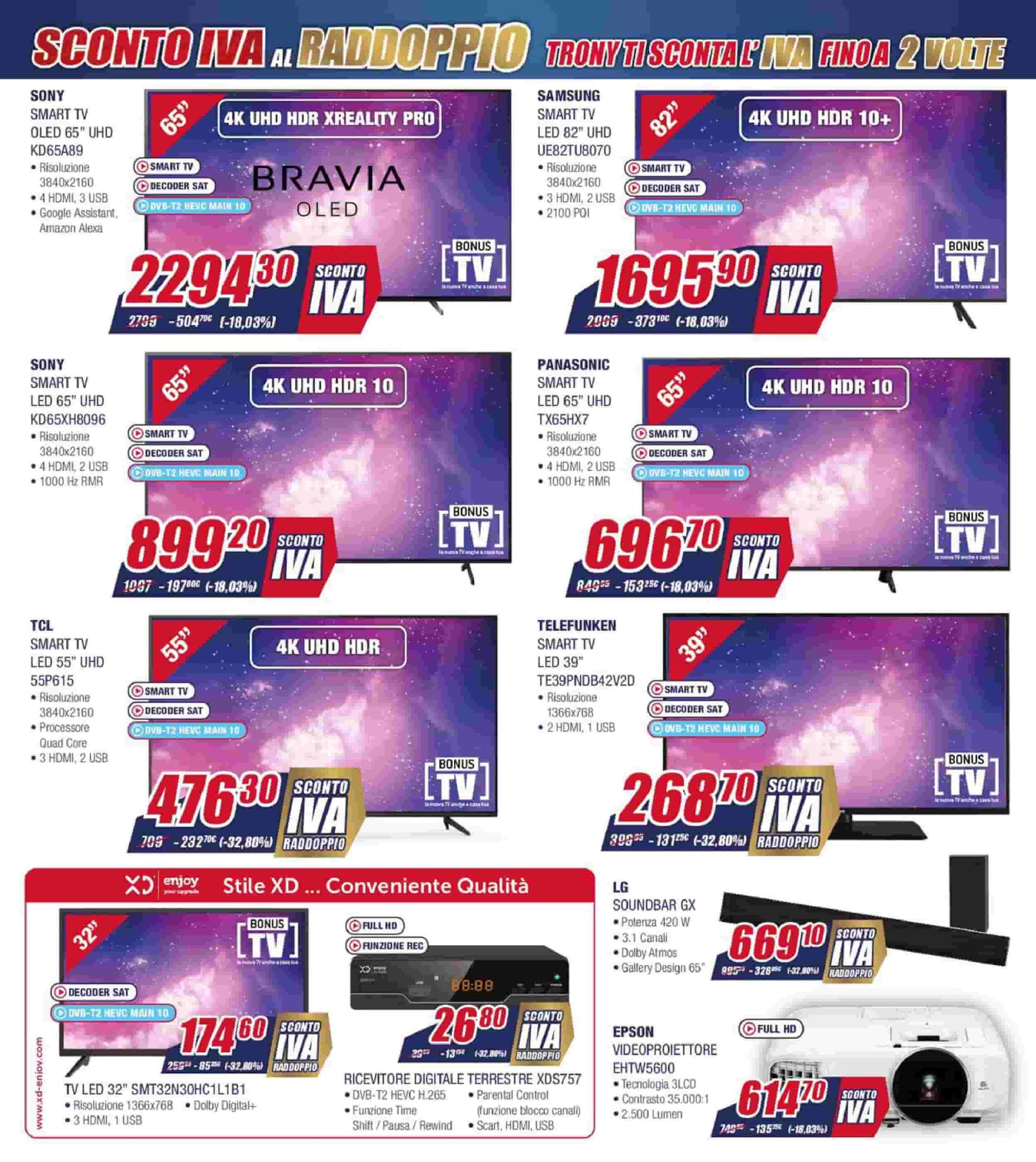 Infine, per quanto concerne le televisioni, invece, ottimo prezzo per la nuovissima LG NanoCell 50NANO866, venduta a 899,30 euro, con un ribasso di 195 euro sul costo di listino. Da sottolineare anche la promozione sul digitale terrestre XDS757 venduto a 26,80. In particolare questo prodotto vi sarà molto utile nei prossimi mesi visto che ci sarà uno switch off e tutte quelle tv che non hanno un ricevitore DVB-T2 al proprio interno non funzioneranno più. Nello specifico il prodotto offerto da Trony è Full HD ed è anche capace di registrare.