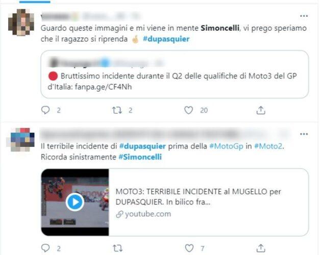 Su Twitter diversi utenti hanno notato delle similitudini tra l’incidente di Jason Dupasquier e quello di Marco Simongelli, scomparso prematuramente il 23 ottobre 2011 durante il Gran Premio della Malesia.
