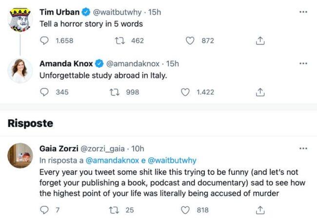 In un post Twitter, la pagina ‘Tim Urban‘ ha scritto: “Racconta una storia dell’orrore in cinque parole” e la Knox ha risposto: “Indimenticabile studio all’estero in Italia”.