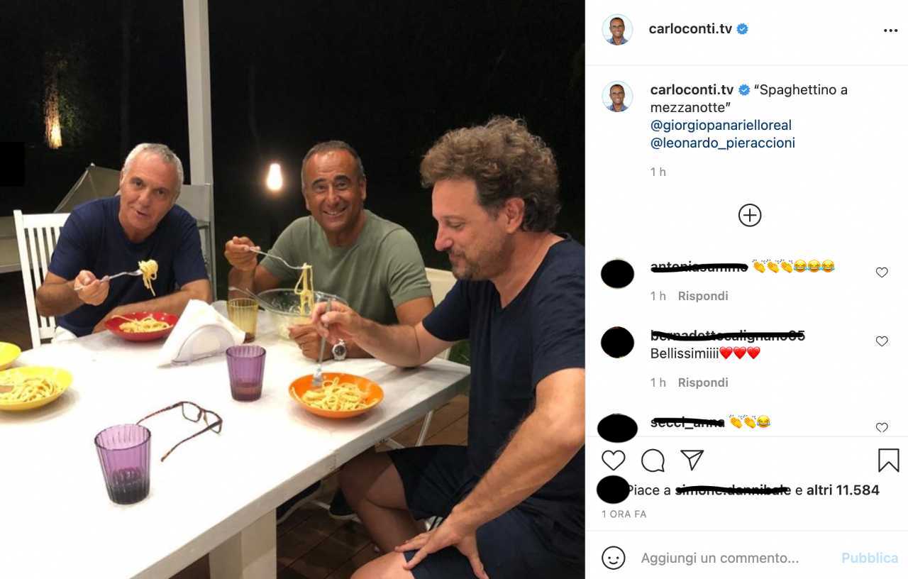 In una foto pubblicata su Instagram, vediamo Carlo Conti super abbronzato, soprattutto se lo mettiamo a confronto con gli amici di sempre Leonardo Pieraccioni e Giorgio Panariello, in sua compagnia durante la serata. Un colore così scuro che un utente scherza sul fatto che il conduttore non si vede con lo sfondo nero alle sue spalle.