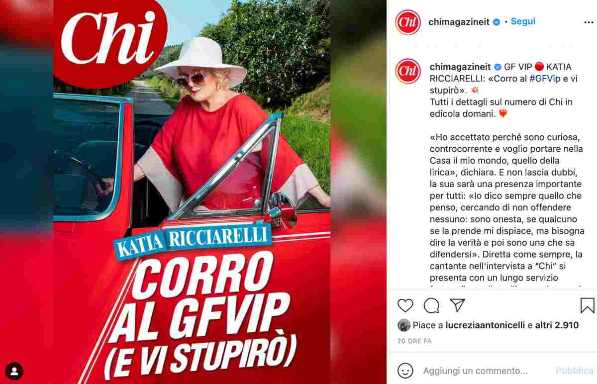 Nel numero di “Chi” in uscita oggi in tutte le edicole italiane, il direttore del settimanale e conduttore del reality show di Canale 5 ha annunciato ufficialmente che Katia Ricciarelli è la nuova inquilina della casa del Grande Fratello Vip. La cantante lirica ed ex moglie di Pippo Baudo si è fatta fotografare dal magazine sulle colline gardesane e a bordo di un’auto d’epoca con modelli.