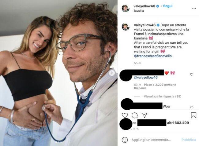 Per comunicare i suoi fan la lieta notizia, Rossi ha deciso di pubblicare un divertente post sulla sua pagina Instagram in cui si è mostrato insieme alla sua bellissima compagna Francesca con il pancione.