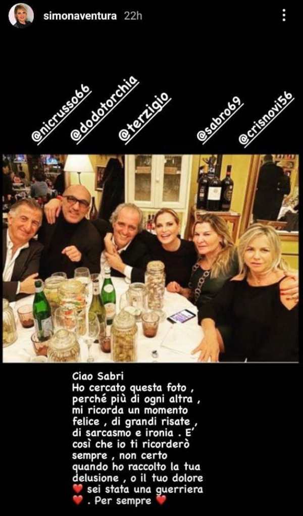 Purtroppo però è chiaro il dolore provato da Simona Ventura che scrive: “Ciao Sabri. Ho cercato questa foto, perché più di ogni altra mi ricorda un momento felice, di grandi risate, di sarcasmo e ironia. Io ti voglio ricordare così sempre, non certo quando ho raccolto la tua delusione, o il tuo dolore. Sei stata una guerriera. Per sempre”.