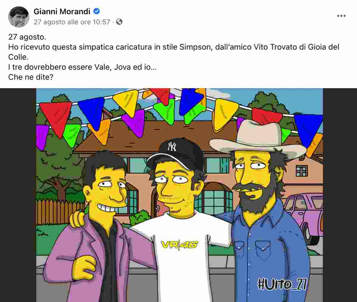 Sui social, Gianni Morandi ha condiviso una caricatura in stile Simpson, creata da Vito Trovato. Nell’immagine, vediamo il cantante in compagnia con Jovanotti e Valentino Rossi. Sotto al post ci sono stati una pioggia di commenti, tra questi si legge: “Sai perché nei cartoni disegnano quasi sempre le mani con tre dita? Sembra per fare prima”.