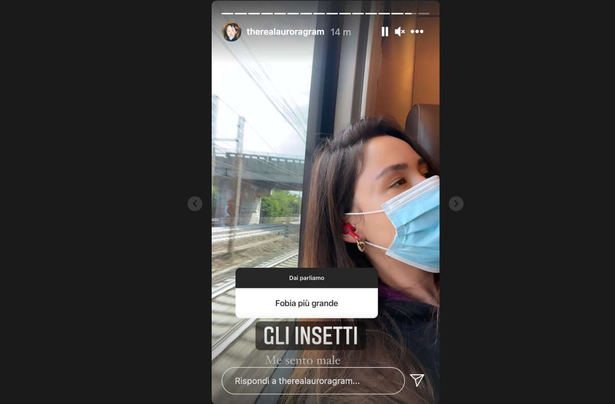 Un follower, per tenere compagni ad Aurora Ramazzotti nelle tre ore di viaggio in treno che le aspettano, le ha chiesto quale fosse la sua fobia più grande. La risposta dell’influencer non tarda ad arrivare, tanto che risponde in maniera secca: “gli insetti”. Poi, per sottolineare quanto non li sopporta, aggiunge in romanesco: “Me sento male”.