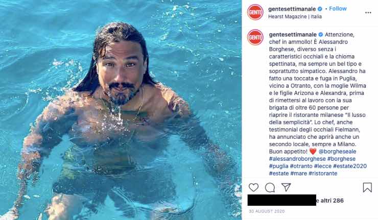 O ancora basti pensare a quanto riportato sui social dal settimanale Gente in merito ad uno scatto con i capelli bagnati. Postando una foto di quest’ultimo, tempo fa scriveva, tra le altre cose: “Attenzione, chef in ammollo! È Alessandro Borghese, diverso senza i caratteristici occhiali e la chioma spettinata, ma sempre un bel tipo e soprattutto simpatico.”