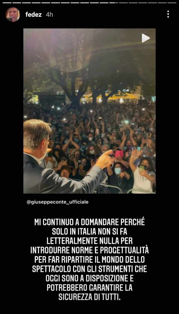 Dopo le immagini che arrivano da Cosenza in cui si vede la piazza gremita di persone per ascoltare un comizio elettorale di Giuseppe Conte. Fedez ha deciso di sfogarsi e prendere le parti del mondo dello spettacolo che da due anni vive una situazione precaria, sottoposta a continui freni.
