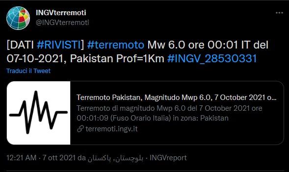 Mentre in Italia era da poco passata la mezzanotte, in Pakistan era notte inoltrata. Il sisma si è verificato verso le 2:30 di notte nella zona Asia/Kabul. Le coordinate geografiche, latitudine e longitudine, sono le seguenti: 30.143, 68.003 ad una profondità di 1 chilometro.