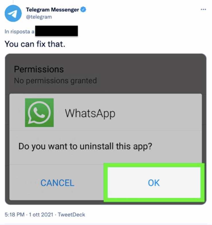 Il primo ottobre, come riporta Controcorrenteonline.it, newsby, Androiditaly, Telegram Messenger su Twitter ha condiviso un messaggio, presumibilmente ironico, nella cui foto è rimarcato il tasto “ok” in risposta alla domanda “Vuoi disinstallare questa app?“, in riferimento proprio a Whatsapp.