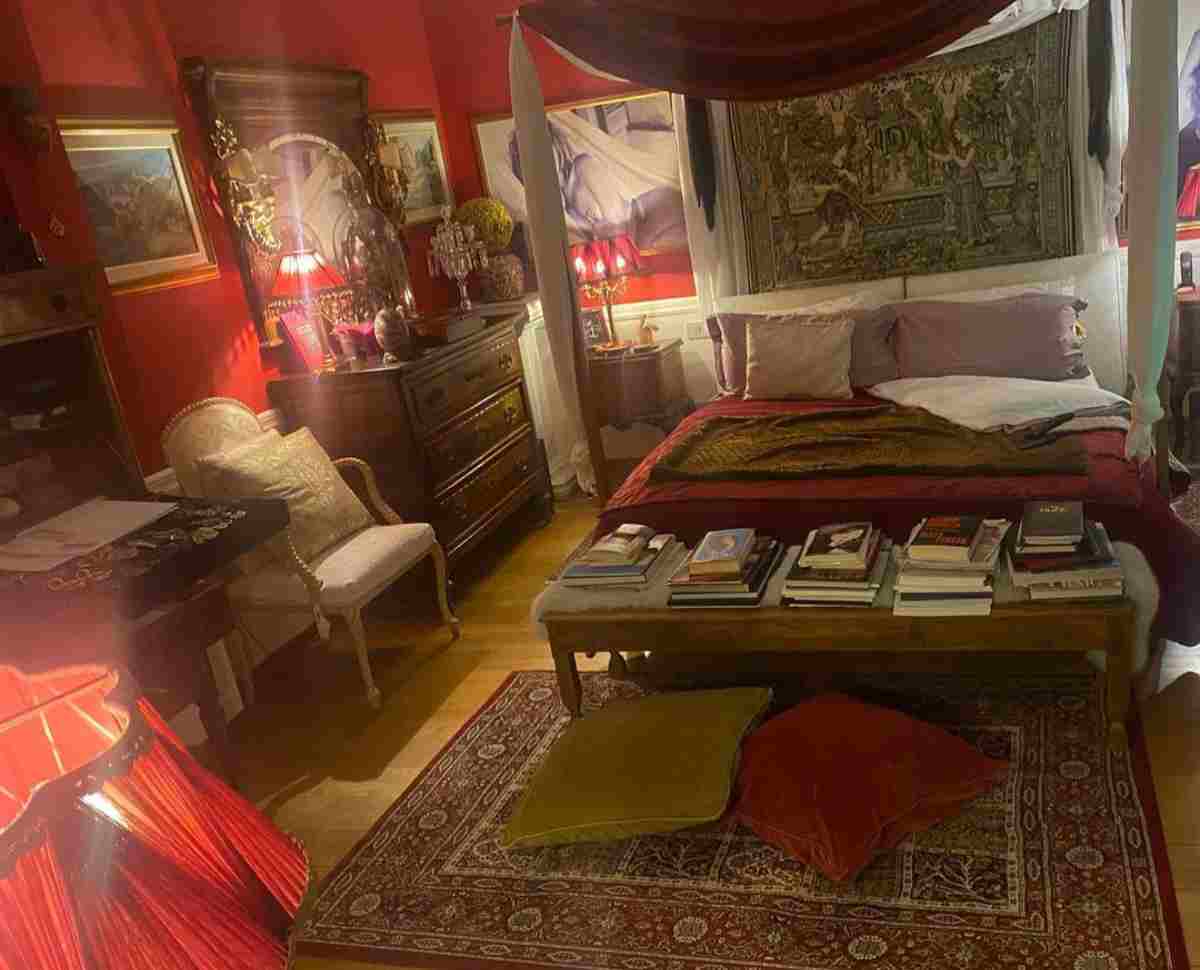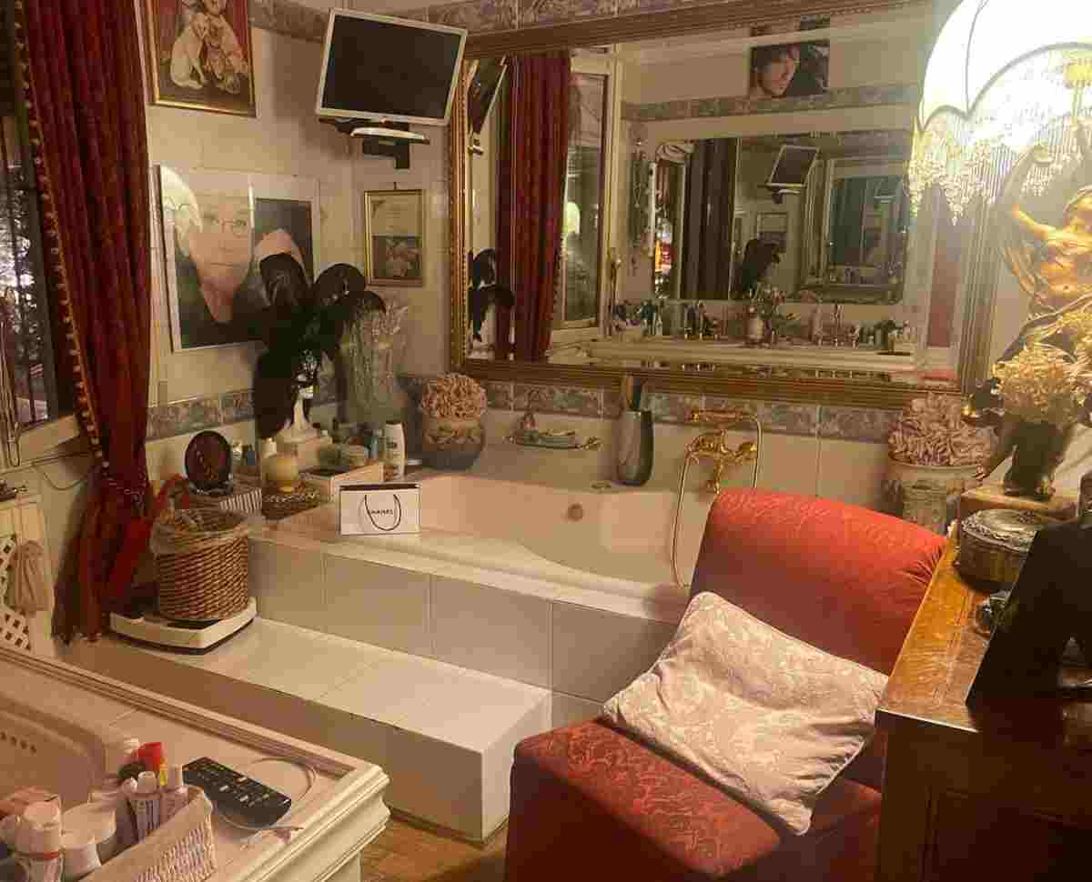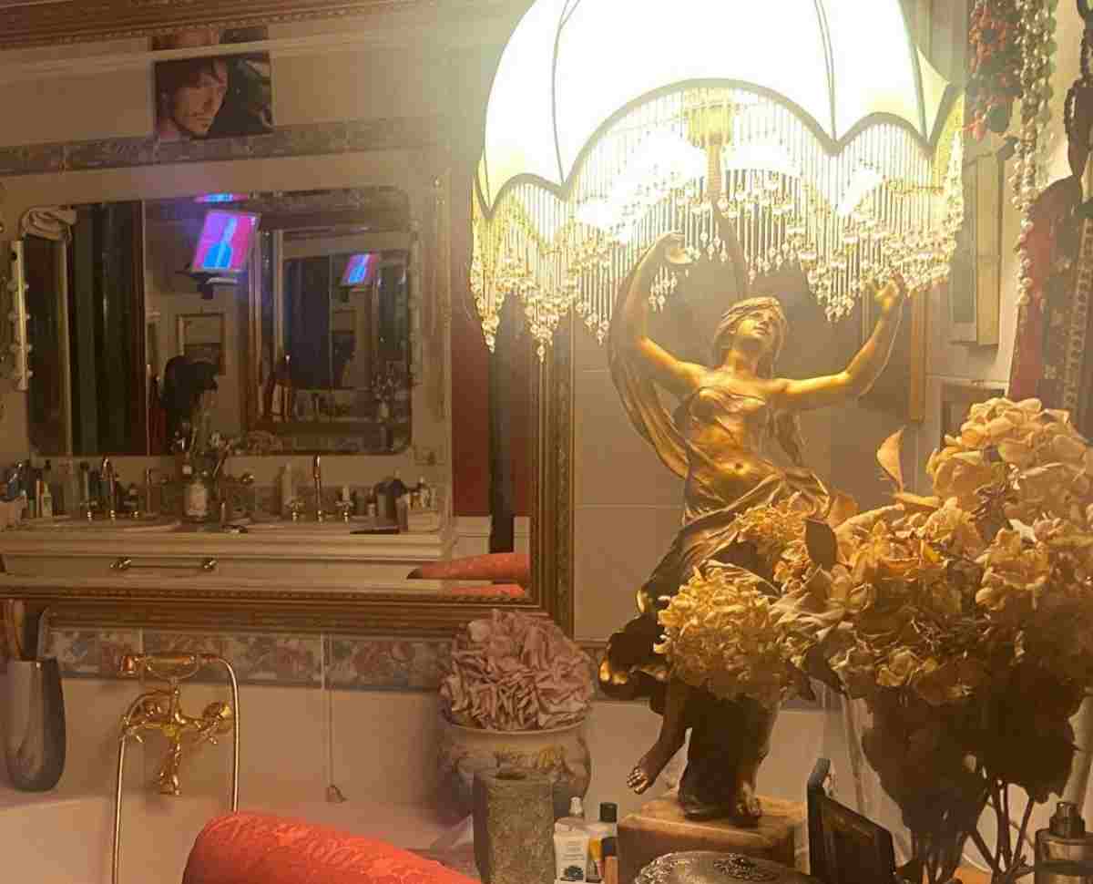 Nella sala da pranzo vediamo un grande divano color bordeaux ed un caminetto; nella camera da letto c’è un grande letto a baldacchino. In entrambe le stanze che un grande tappeto persiano. Mentre nel bagno c’è una vasca circondata da poltroncine e un televisore, segno che la showgirl passa molto tempo nella vasca per rilassarsi.