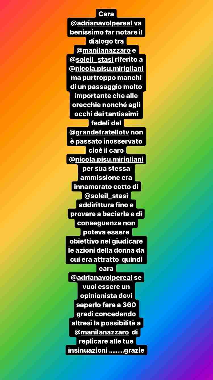 Ecco cosa ha detto: “Cara Adriana Volpe va benissimo far notare il dialogo tra Soleil e Manila a Nicol. Ma purtroppo manchi di un passaggio molto importante che alle orecchie nonché agli occhi dei tantissimi fedeli del Grande Fratello non è passato inosservato. Cioè il caro Nicola per sua stessa ammissione era innamorato cotto di Soleil”.