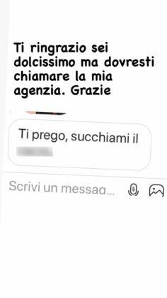 Nel primo messaggio, un utente in risposta ad una sua storica la invita ad una pratica sessuale. La risposta della comica è stata: “Ti ringrazio sei dolcissimo ma dovresti chiamare la mia agenzia. Grazie”. Negli altri due messaggi troviamo da una parte una richiesta di foto intima e nell’altra una dichiarazione. Nell’ultimo, anche la Follesa lo considera accettabile e aggiunge un “Meglio dai.”