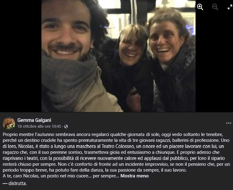 La Galgani ha ricordato un ballerino morto a Riad. Ecco il suo pensiero: “Uno di loro, Nicolas, è stato a lungo una maschera al Teatro Colosseo, un onore ed un piacere lavorare con lui, un ragazzo che, con il suo perenne sorriso, trasmetteva gioia ed entusiasmo a chiunque. E proprio adesso che riaprivano i teatri, con la possibilità di ricevere nuovamente calore ed applausi dal pubblico, per loro il sipario resterà chiuso per sempre”.