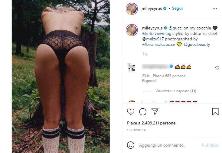 Sul suo account, oltre a mostrare le tantissime esibizioni. Mostra outfit e anche qualche scatto molto provocante. Come nell’ultimo caso. Uno scatto che ha fatto esplodere completamente il web e che difficilmente non sarà un pezzo di storia dei social. Nella foto si vede Miley leggermente chinata in avanti con il suo Lato B in primo piano.