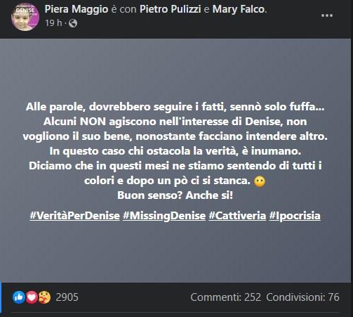 Nell’ultimo caso, la mamma di Denise si è scagliato contro quelli che, secondo lei, stiano facendo fuffa. Ecco alcuni passaggi: “Alcuni NON agiscono nell’interesse di Denise, non vogliono il suo bene, nonostante facciano intendere altro. In questo caso chi ostacola la verità, è inumano.” Nessun nome all’interno del post ma parole che fanno capire come siano indirizzate a qualcuno di specifico.
