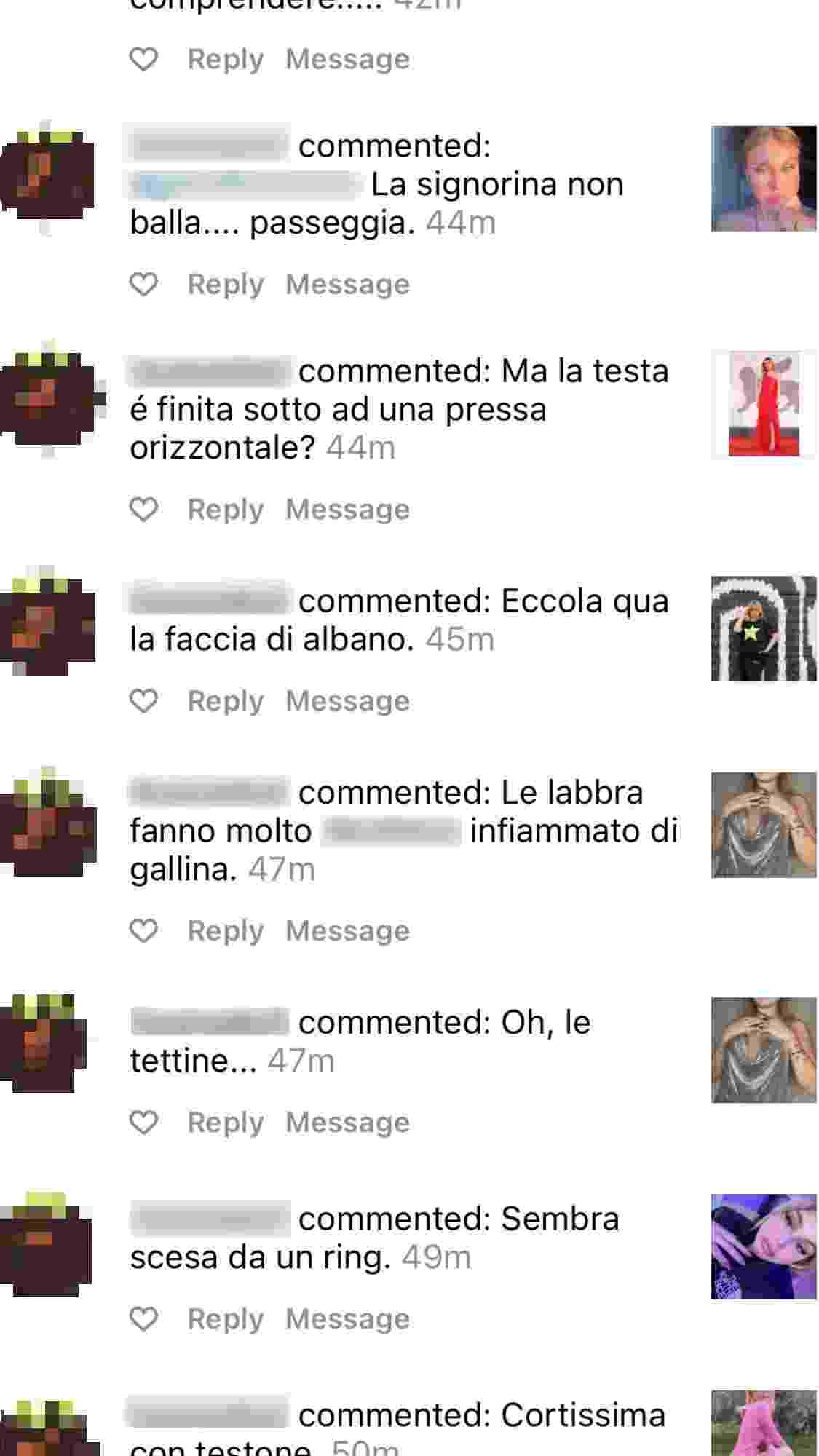 La giovane artista ha postato uno screen in cui mostra la “caparbietà” di un’utente. Tanti commenti, non positivi, inaspettati dato che sono arrivati nel giro di pochissimi minuti. Le parole sono state tutte contro la giovane ragazza. Si riferivano dalle labbra alla testa fino ad arrivare al seno. Insomma, un’utente che non vede di buon’occhio Jasmine Carrisi. Inevitabile la reazione della ragazza che è rimasta molto sorpresa di vedere così tanto accanimento.