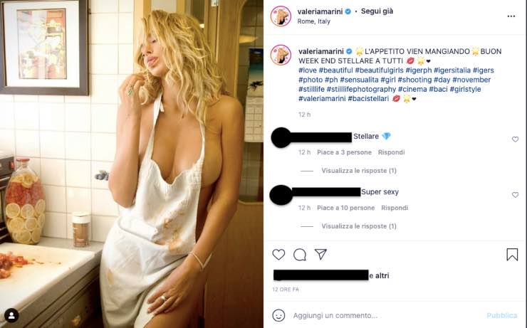 “L’appetito vien mangiando. Buon week end stellare a tutti”, questo è il breve ma significativo messaggio che si può leggere nella didascalia che accompagna il post, inerente e legata proprio al contesto e alla mise di Valeria in questa occasione.