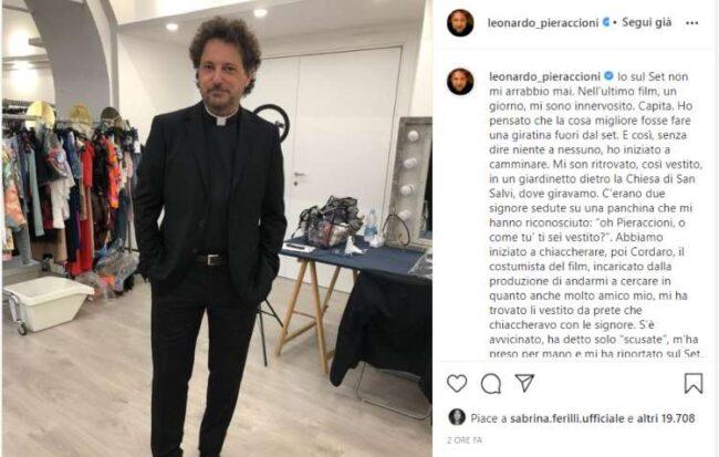 “Senza dire niente a nessuno ho iniziato a camminare – ha scritto Leonardo su Instagram – mi sono ritrovato, vestito da prete, in un giardinetto dietro la chiesa dove giravamo“. A quel punto l’attore ha raccontato di aver incontrato due signore che l’hanno riconosciuto. Dopo qualche tempo è arrivato il costumista del film che, vedendolo vestito da prete che parlava con le signore, lo ha preso per mano e lo ha riportato sul set con un semplice: “Scusate”.