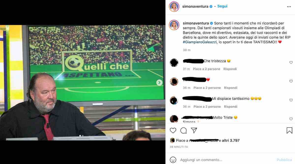In tantissimi hanno voluto lasciare un commento e un ricordo su chi era Galeazzi per il mondo del giornalismo e dello spettacolo. Tra questi c’è anche una delle conduttrici italiane più amate ed apprezzate dal pubblico. La Ventura, infatti, ha fatto un post su Instagram salutando il giornalista.
