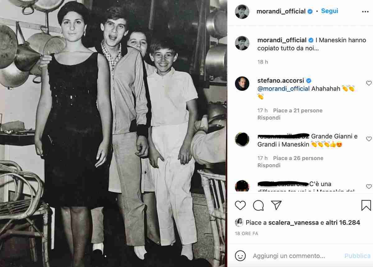 Nello scatto in bianco e nero vediamo un giovanissimo Gianni Morandi accanto ad altre persone. La frase, ovviamente, è una battuta scherzosa che l’artista italiano ha voluto fare dopo la polemica alimentata dai Cugini di Campagna sull’outfit dei Maneskin durante l’open act dei Rolling Stones a Las Vegas.