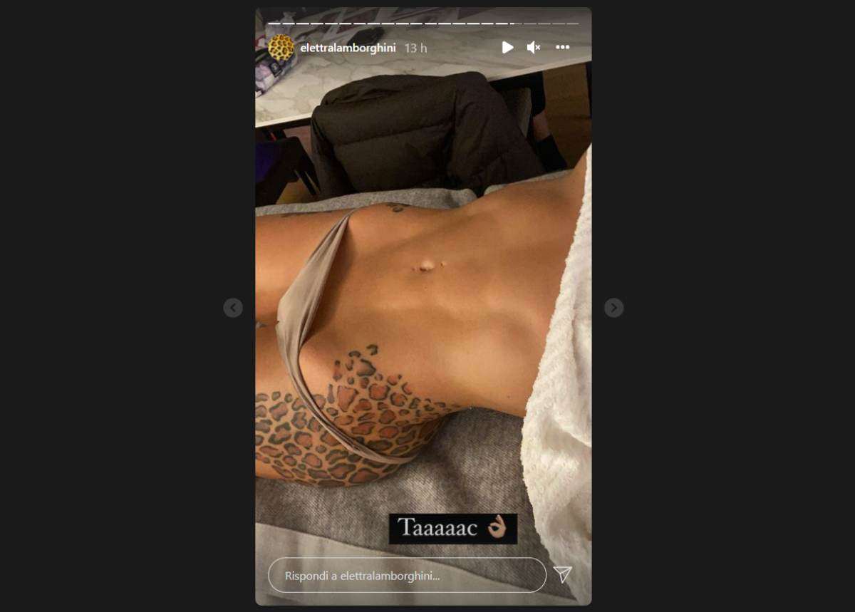 L’ereditiera è distesa su un lettino dove fa vedere il suo fisico tonico: forme sensuali e addome piattissimo, dove lo slip è abbassato sul filo del “punto g”. In bella vista è il suo tatuaggio leopardato che è diventato un segno distintivo.