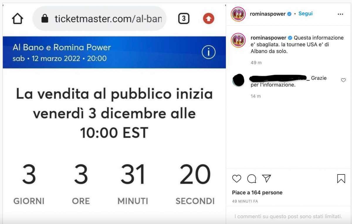 “Questa informazione è sbagliata. La tournee negli USA è di Albano da solo”, ha scritto la Power pubblicando uno screen in cui si vede la vendita dei biglietti per i concerti di Albano e Romina. Una precisazione importante per i tanti fan.