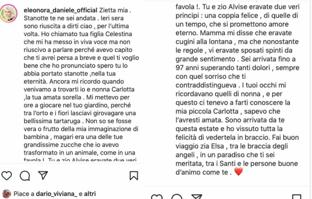 La donna era la sorella della nonna Carlotta, venuta a mancare qualche anno fa. “I tuoi occhi mi ricordavano quelli di nonna, e per questo ci tenevo a farti conoscere la mia piccola Carlotta, sapevo che l’avresti amata”, ha raccontato Eleonora, rivelando che è andata da lei questa estate.